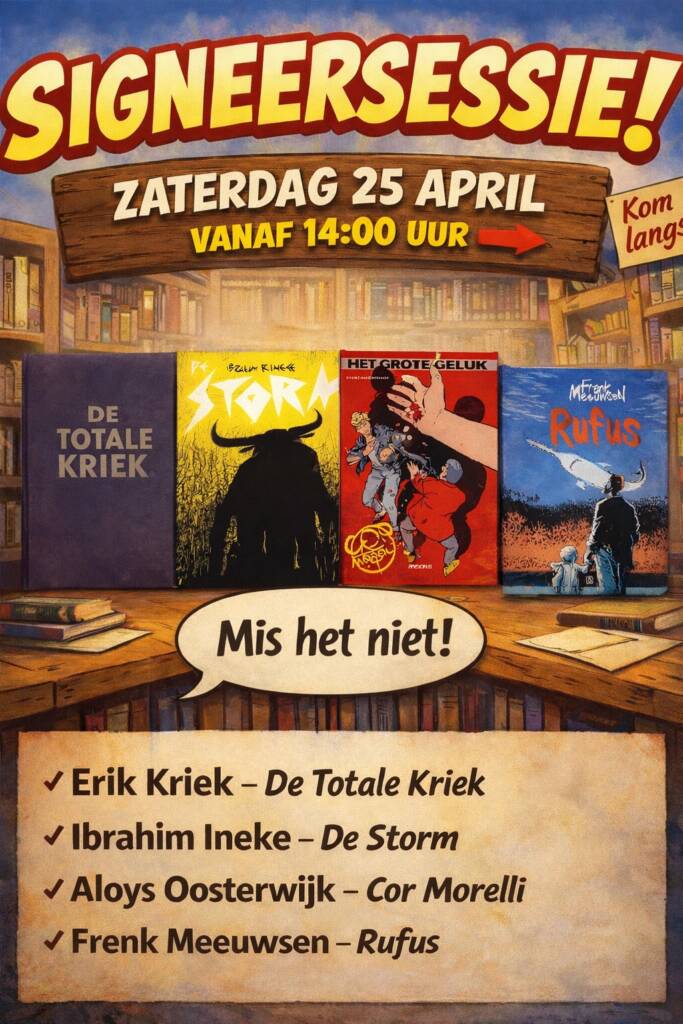 Regelmatig nodigen we een tekenaar uit voor een exclusieve signeersessie bij ons in de winkel. Zo zijn onder andere al grote auteurs als Brecht Evens, Peter de Wit, Wasco, Hanco Kolk en Guido van Driel minstens een keer bij ons op bezoek geweest. Iedere signeersessie is een bijzondere ervaring want de tekenaar signeert elk boek met een unieke tekening. We maken er dan ook altijd een sfeervolle middag van, als het weer het toelaat in onze gezellige tuin achter de winkel.
